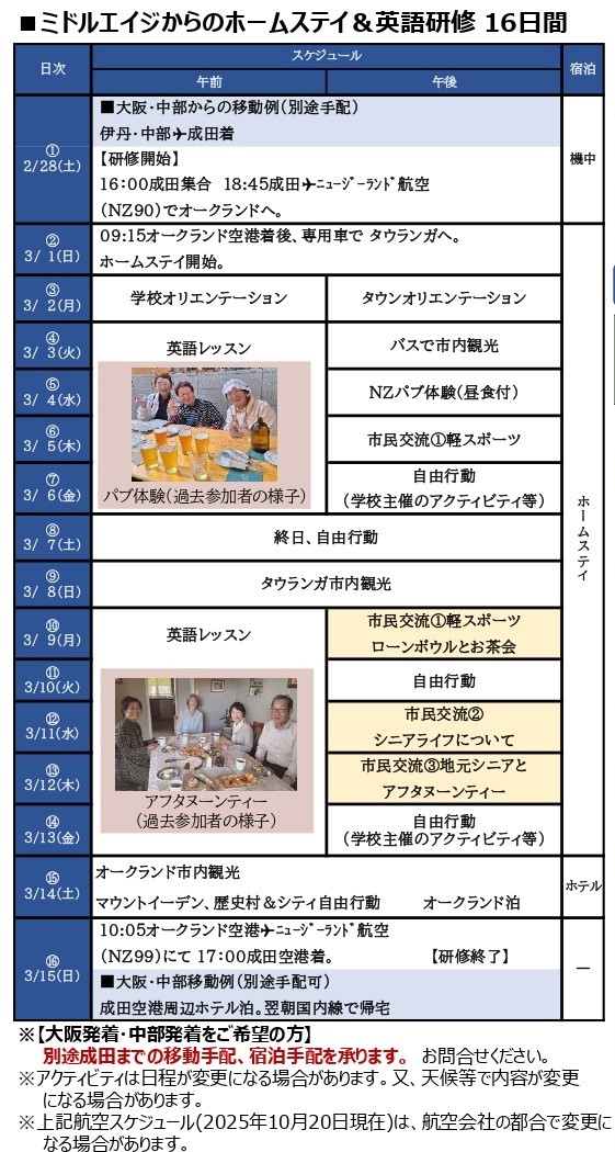 ※旅行代金に含まれるもの・・・国際航空券(往復エコノミークラス)、ベイラーニングアカデミーでの英語レッスン費用、旅行日程に明示したアクティビティ費用、旅行日程に明示したホームステイ代とホームステイ期間中の3食およびオークランドでの宿泊ホテル代